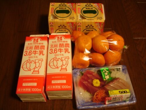 今週もまずはみかん@398円スタート。全快は1個カビ生えちゃったから、冷蔵庫で保存しなきゃダメかなぁ。納豆は旭松完熟超小粒納豆が88円だったんで2個。あと、今日の晩御飯用にお刺身2点盛り合わせ@500円が半額になってたんで、それを購入。他にも豚肉…