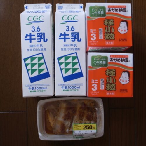 タカノ 極小粒ミニ@89円×2 CGC 3.6牛乳@149円×2 かつ煮@250円