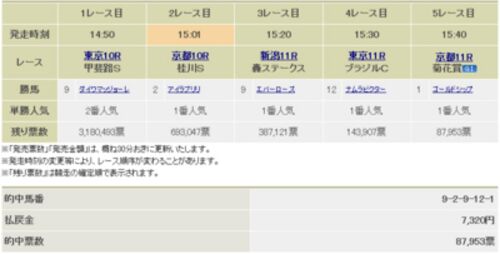 今週の結果は 東京10R:8枠11番サトノアポロ(1番人気・2.0倍)→3着 京都10R:5枠5番ニシノビークイック(3番人気・5.0倍)→11着 新潟11R:7枠9番エバーローズ(1番人気・1.5倍)→1着 東京11R:6枠12番ナムラビクター(1番人気・2.5倍)→1着 京都11R:1枠1番…