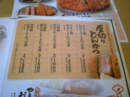 35分くらい待ち時間があったんで、ちょっと遅めのお昼ごはん。いつも行列してるらしいけど、さすがに中途半端な時間だけあってスムーズに入店。注文は最初から『やまと豚の厚切りロースかつ定食@2,484円』に決めてる。今日のごはんは白米orイカの炊き込みご…