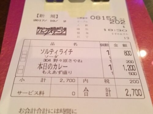 18時30分入店。ゆりゆりメニューがカレーでしかもカツカレーだったんでもえあず盛りで。 18時30分通常ステージは、しょうこちゃん(月元しょうこ)・リカチィ(浅見リカ)・ゆな(浦瀬結菜)・春日菜子(なーこ)。リカチィ制服のボタンが取れて前回は白石先…