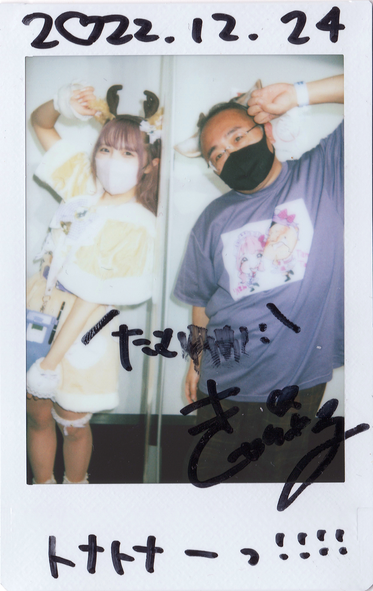 で、ぼんちゃん。入場特典がチェキ券2枚だったから、アップグレード2枚で。2枚目横ってお願いしたのに縦で撮っちゃって、撮り直してもらったんだけど、ぼんちゃん颯爽と縦に描き始めて爆笑ww 強引に枠っぽくしたら、ちょっとクリスマスっぽくなった?w