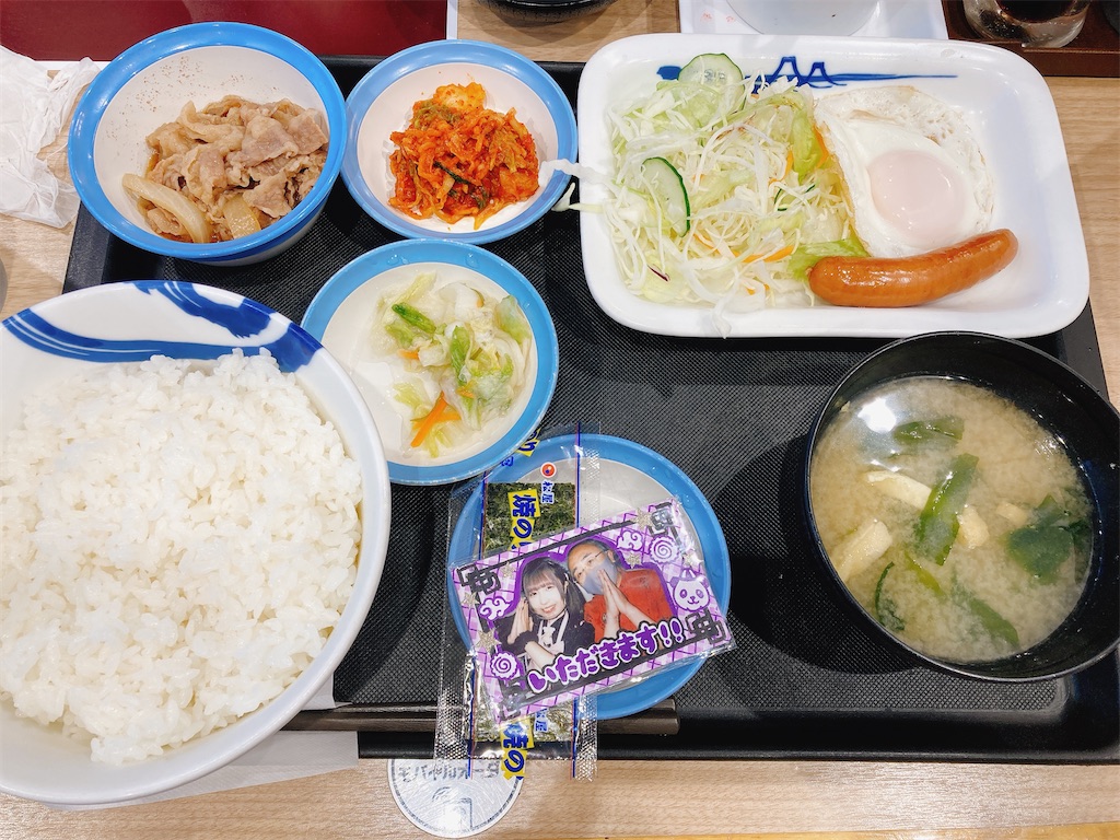からの朝ごはんは安定の松屋。なんか安いと思ったら目玉焼きシングルにしてたw キムチもらったからおかずは足りるけど。